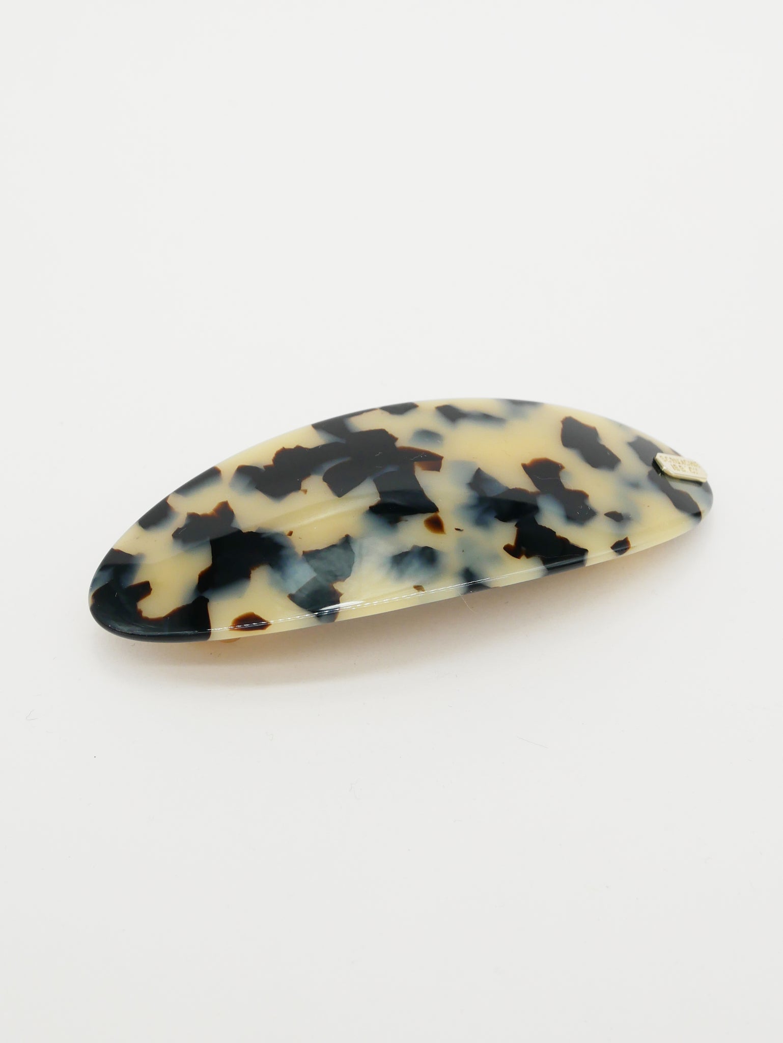 Barrette confectionnée en acétate de cellulose de haute qualité, un matériau noble reconnu pour sa légèreté, sa résistance et sa brillance naturelle. Entièrement fabriquée en France, dans les ateliers d’Oyonnax – berceau historique de la lunetterie et de l’accessoire capillaire – elle incarne le savoir-faire artisanal français.